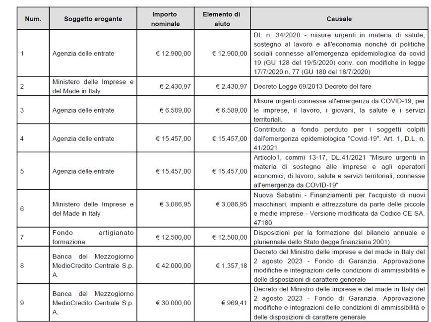 La società ha ricevuto, nell’anno 2024, i seguenti benefici pubblici, sovvenzioni, contributi, incarichi retribuiti e comunque vantaggi economici di cui alla L. 124/2017, secondo il principio di cassa: